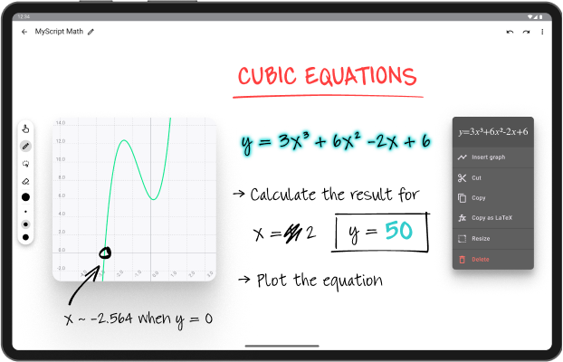 MyScript Calculator is meant for quick, simple calculations, perfect for your phone. Meanwhile, MyScript Math has been designed for use with a tablet and pen, and offers graphing capabilities, an expanded workspace, and access to multiple math notes.